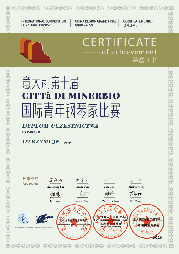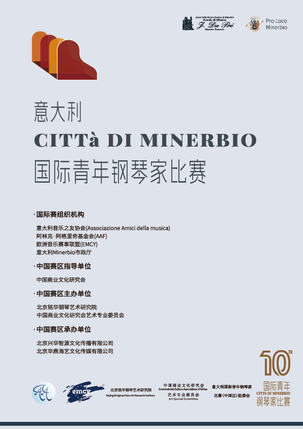 意大利第十届Città di Minerbio国际青年钢琴家比赛,在意大利具有重要影响力,是官方支持并推广的国际青年钢琴赛事之一,是由意大利艾米利亚-罗马涅大区文化局、米内尔比奥市政府、博洛尼亚国立音乐学院、意大利钢琴教师协会、佛罗伦萨国际艺术交流中心联合主办。届时,迎来了来自于40十多个国家,100余名专业钢琴家的参与,从2025年开始,我们中国选手也将有机会参与该项赛事,由该赛事组委会授权北京铭华钢琴艺术研究院将作为中国区该项赛事的全权代理,在中国进行选拔后,挑选30位优秀的青年钢琴家代表中国赴意大利进行国际总决赛!